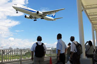 夏休み中とはいえ平日の昼間で気温は35度、それでも30人ほど来ていた。通過する飛行機の真下でもなく真横でもない、中途半端な立地なのがやや残念。
