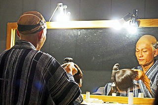 案内してくれたのは平井力という大部屋俳優。スッピンで現われメイクから結髪、侍姿の着付けと変身ぶりをすべて見せてくれたが、40分もかかった。