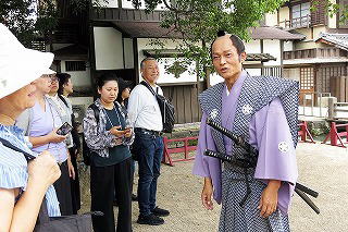 侍姿のまま映画村を通り抜け撮影所を案内してくれた |