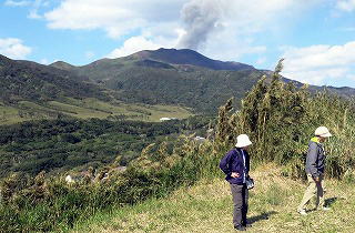 9年前の上陸時はどこも行くところがなく、軽四に分乗して飛行場へ行き火山の噴煙と集落を眺めるだけだった。(9/18) |