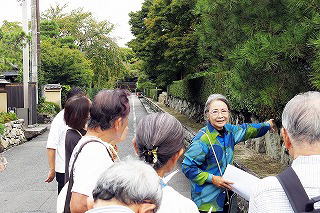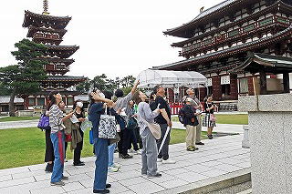 薬師寺で大学講師の説明を聞くまいまい京都の参加者 |