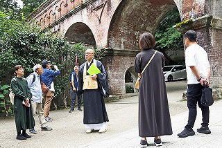 南禅寺の僧侶から境内を横切る水路閣の説明を聞く |