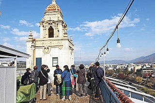 営業開始前に屋上を含めて館内すべてを見学した。中でもエレベータは現役として日本最古で、今もエレベータボーイがハンドルレバーを操作しながら稼働させている。(12/1) |