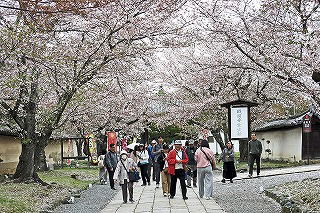 現在桜の木が多いのは三宝院と霊宝館前の道。今年は花の季節が少し遅いようで枝垂れ桜は終わりかけでも、桜の並木はまだまだ見頃だった。(4/6) |