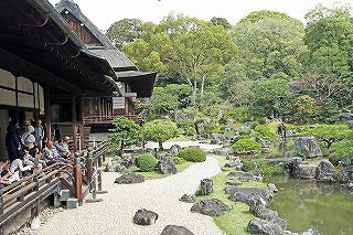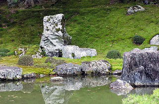 鶴亀庭園としては先日見た南禅寺金地院の小堀遠州作の枯山水庭園がもっとも有名だという。いずれも特別名勝に指定されているが、仙人的にはこっちの方が名園に見える。 |