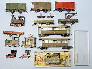 思い切って近所の模型屋に相談したらヨーロッパ物は手がけたことがないと断られた。こうなったら面倒でもヤフオクに出品するしかない。ここで並べたのはHOmという線路幅12ミリのもので、この他にまだ客車や貨車が山ほどある。さらにHOnという9ミリのものも。
